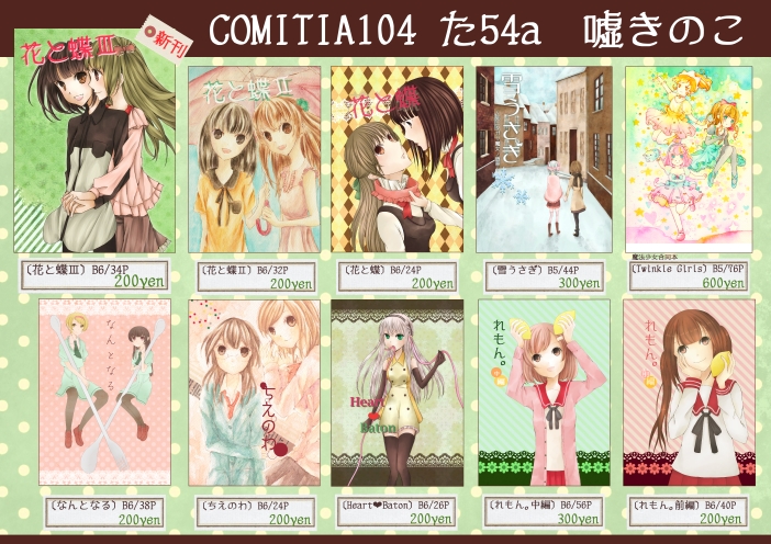 おしながき~ Category:未選択 Date:2013年05月04日 どうも!製本真っ最中です。印刷されるのが遅いったらなんの~珍しくおしながきなんて作ってみちゃいました!PC壊れてから一年ちょいで数的には元通りって感じですね。どうやって掲げたらいいんだろう!そろそろスペースに入りきらなくなりそうです。B6本がほとんどなのでかろうじてという感じですが。あとペーパーもつくりました。いつもよりだいぶまともなペーパーなので、(いつもどんだけひどいペーパーなんだって感じですが)ペーパーだけでも是非に~誤字みっけてしまったのですがスルーで…ではでは明日は〔た54a〕でお待ちしておりますーよろしくお願いいたしますー!そういば今朝人身あったみたいなんで、明日はそういうのないといいなあ。 [1回]