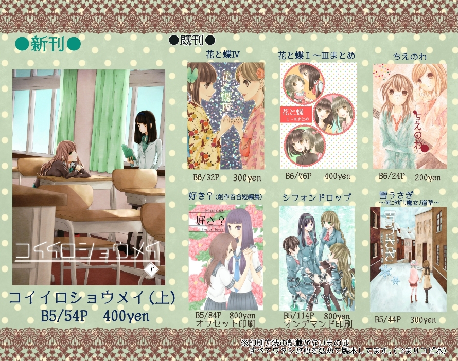 GLFes11☆ Category:同人関係 Date:2014年03月02日 たいへん遅くなりました…!!!なんとか本日のGLFes11の新刊を持っていけそうです…!果たしてイベント前に見て下さる方がいらっしゃるのかどうかという問題ですが…!スペース:オペラ37☆新刊 「コイイロショウメイ(上)」数学教師と女子高生のお話になります。 表紙はこんな感じです。これよりカーテンの緑結構きついのですなんかもう眠いのを通り越して眠いっていうより瞼重過ぎてぱたって寝られそうな感じ…ああでも朝も早いのだ…とりあえず荷造りをしなければ… おしながきですー多分間違っていない…と思いたい…ではでは取り急ぎな感じですが、本日はよろしくお願いいたします。 [0回]PR