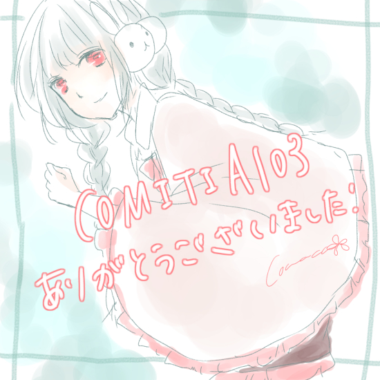 COMITIA103お疲れ様でした! Category:同人関係 Date:2013年02月04日 もう昨日になってしまいましたが、COMITIA103お疲れさまでした!そして当スペースにお立ち寄り下さった方はほんとにどうもありがとうございました!!今回は初めてのことを色々したので、戸惑うこともありましたがなんとか持っていけてよかったですーまずは個人誌で初めてB5本を作りました。いつもB6なので、倍ですよ倍…!!A3プリンタを持っていないので、表紙は印刷会社に刷っていただきました。これも初めてです。沢山刷ってしまったのでコレどうしようって感じですその中でも失敗したのが、原稿サイズの設定ですが(いつもA4同人サイズで描いてるのに何故B4にしたし…)あとは紙とか紙とか遊び紙の手前に来る方とかずっと使ってみたくても高かったので(笑)なかなか手が出せませんでしたが、使えて良かったですー本文の印刷にえらい時間が掛かるので、1時間くらいしか寝てない状態で行きましたが、やっぱり2時過ぎ位から睡魔さんがスイマスイマ攻撃してきたので、ぼーっとしてました(笑)創作意欲めっちゃ湧くわーという気持ちと容赦なく押し寄せてくる睡魔がバトってました。自分の計画性のなさやら突発ネタの詰めの甘さに活動3年目にしてようやく気付くことが色々あって(流石に理解するのが遅いわ!)色々見つめ直してみて、作品が良くなっていけばなーと思います。さてさて、次回のイベントですがCOMITIA104に申し込もうと思います。多分普通に百合描いてる気がします。あとはGLFes9にも申し込むつもりです。3次で申し込めるといいなあーそんな感じです。それでは、お疲れさまでした!どうもありがとうございました! [1回]