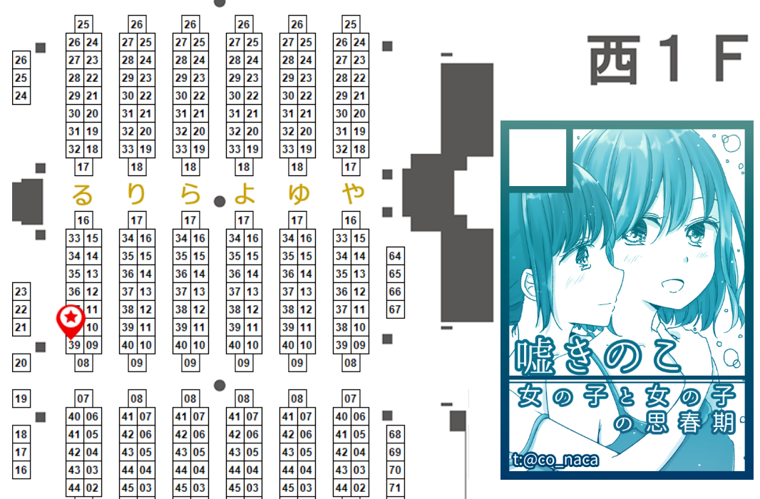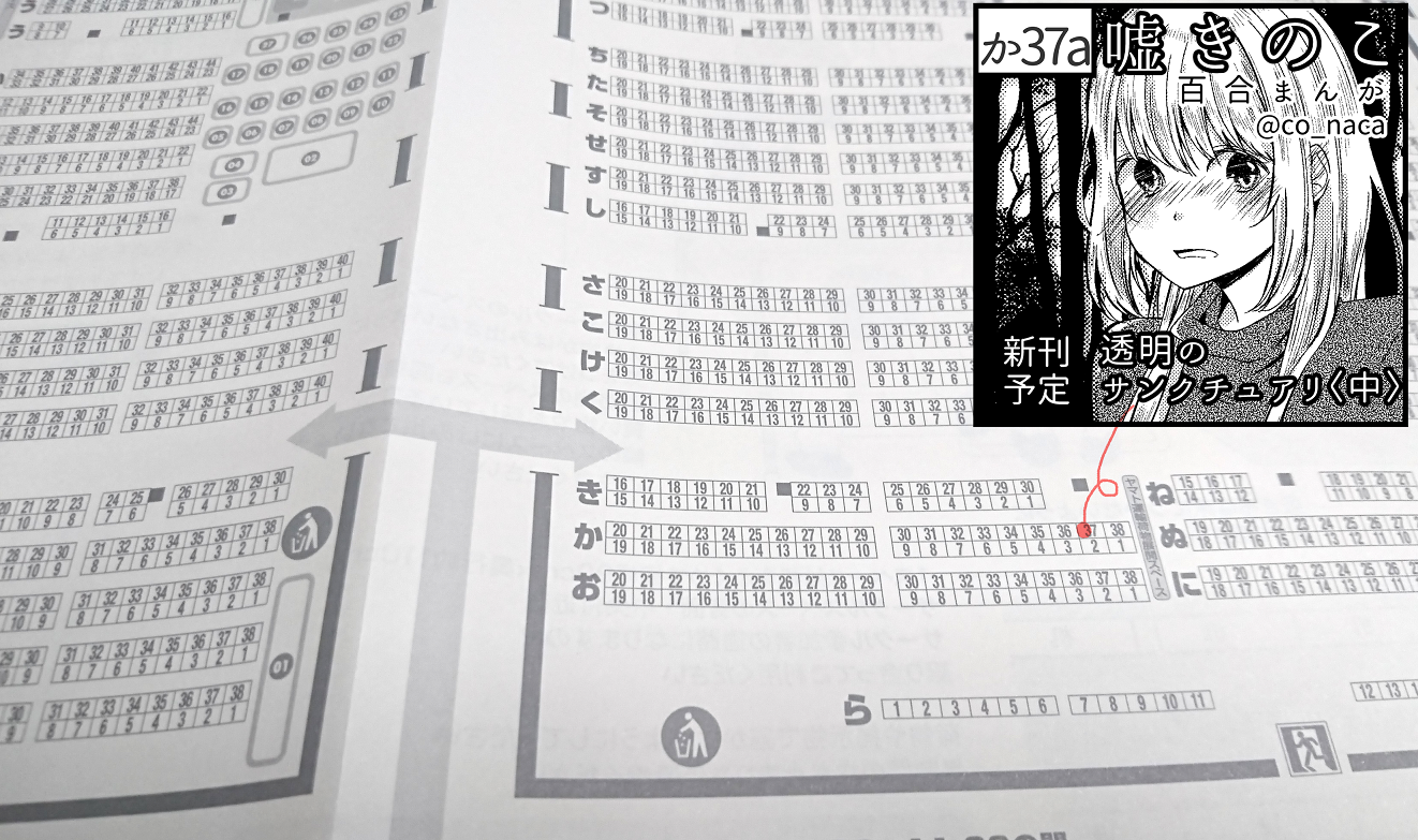 配置は【ち06b/嘘きのこ】にてお待ちしております。西1・2の間っこあたりです。