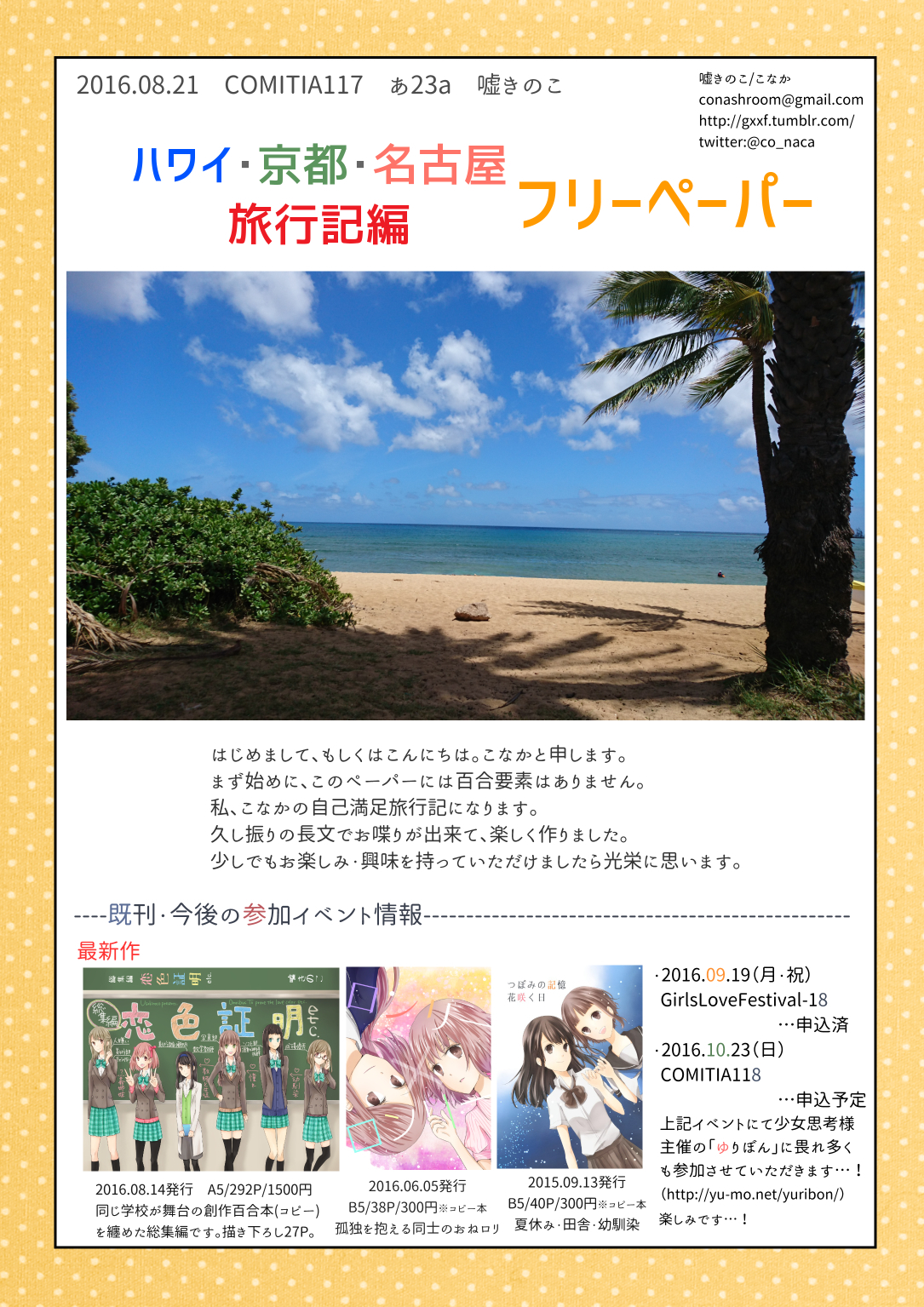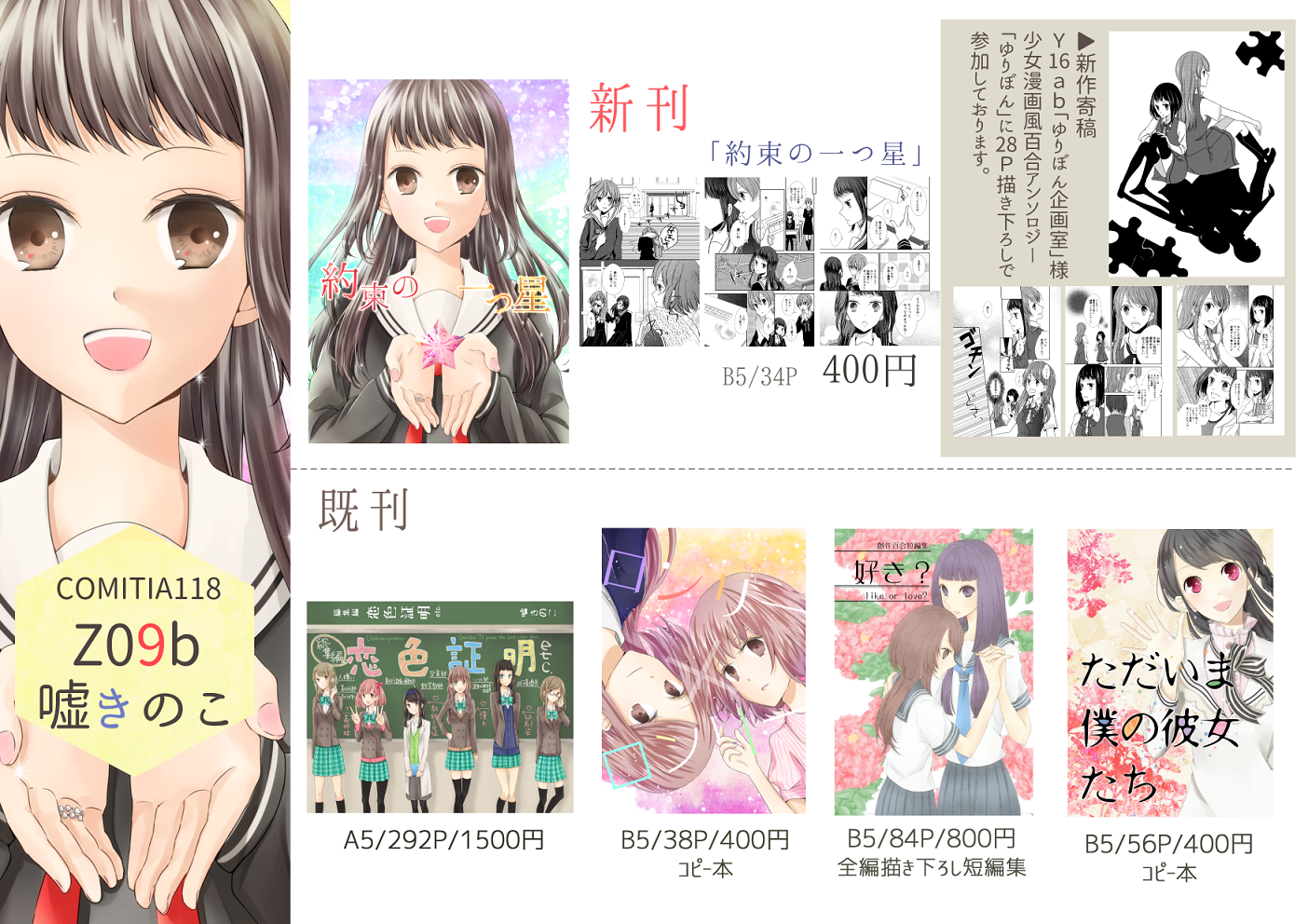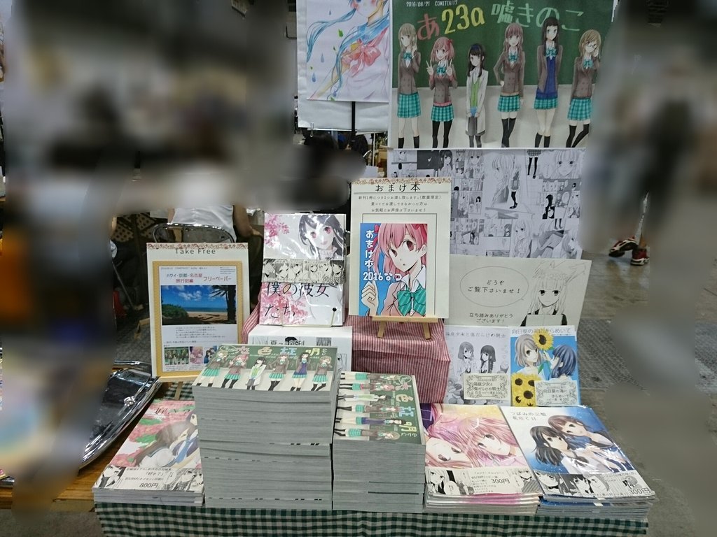 COMITIA118★☆ Category:同人関係 Date:2016年10月22日 こんばんちは。コミティアの新刊、入稿しましたので恐らくある…筈です…!!!◆COMITIA118(2016/10/23) 配置:Z09b ▲サクカです ▲今回はなんとお誕生日席ですやった~!!!◆新刊 B5/34P/400円 オンデマンド印刷中学生の同級生同士のお話しです。全く意識していませんでしたが、流星群の事が出てきたりして、ちょっとタイムリーな感じになりました◎本文サンプルpixiv▼COMITIA118◆創作百合新刊 サンプル by こな@ティアZ09b on pixivそしておしながきです▼ 恋色証明と短編集については、書店から返本依頼したのですが、果たして届くのか…作れそうならペーパーつくりたい と思います。そしてそして!!Y16abの「ゆりぼん企画室」様の少女漫画雑誌風百合コミックアンソロジー「ゆりぼん」に28Pの新作短編でお邪魔させていただきました…! タイトルは「リフレイピース」です。(悩み過ぎて造語にしてしまいました…)「ゆりぼん」はY16abなどで頒布されます。今回A1ポスターを使用する予定ですので、こちらを目印にしてやって下さい…! 当日は何卒よろしくお願い致します…!! [1回]
