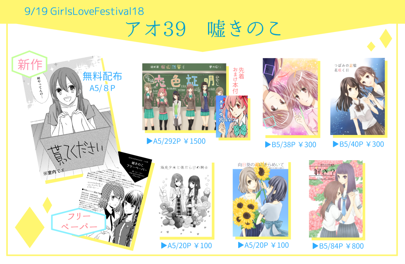 GLF18★☆ Category:同人関係 Date:2016年09月18日 おはようございます!遅ればせながら明日、2019/09/19 GirlsLoveFestival18に参加致します。配置「アオ39」です。おしながきは以下になります。 画像の通り、新しいものは無配本8Pとペーパーになります。是非貰って下さい!!あとコミティアで配布した旅行レポペーパーも置く場所があれば置きます。これから出掛けるので、取り急ぎの更新ですみません…!当日は宜しくお願い致します…!!! [0回]