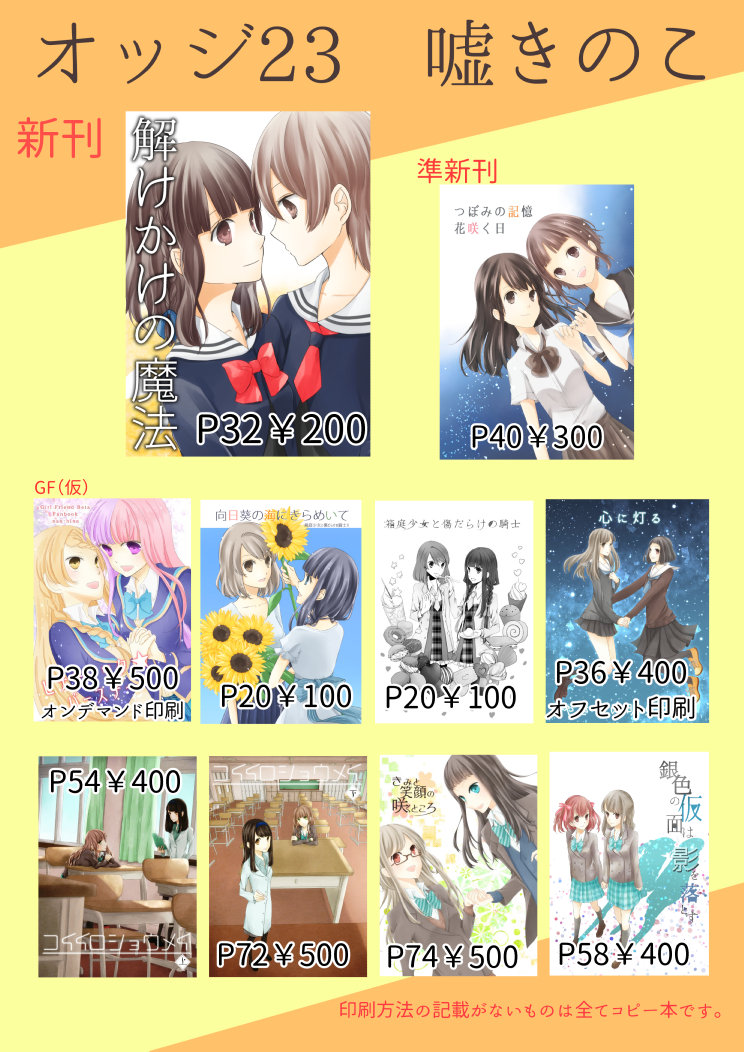 GLFes15のお知らせ★ Category:同人関係 Date:2015年09月13日 例のごとくですみません…遅ればせながら…新刊の方がなんとかなりそうなのでお知らせさせて下さい…!2015/09/13 GirlsLoveFestival15 配置:アニス09恐れ多くも島端ですいえーい■新刊 その1「つぼみの記憶 花咲く日」 B5/40P/¥300田舎の幼馴染の中学生のお話です。↓pixivのさんぷるです。GLFes新刊②つぼみの記憶 花咲く日 さんぷる by こな on pixiv■新刊 その2「向日葵の海にきらめいて」 A5/20P/¥100A5というか化粧断ちしているのでそれより一回りくらい小さいです。コミティアで配布した作品の完全版です。本当は偶数始まりなのです。↓pixivのさんぷるです。GLFea新刊①向日葵の海にきらめいて さんぷる by こな on pixivおしながき作れる余裕がないのでこちらの作品に加え、前回のおしながきと同じラインナップの予定です。 今プリンターさまに頑張って頂いております。ではでは当日はよろしくお願い致します! [1回]