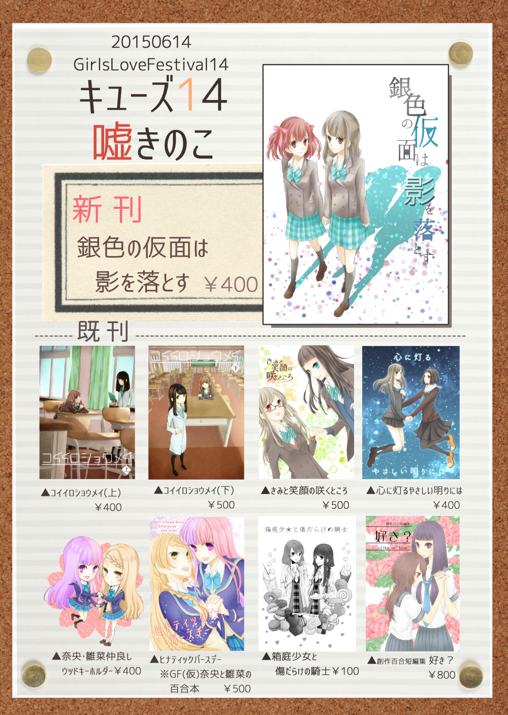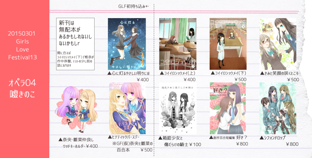 GLF13☆ Category:同人関係 Date:2015年02月28日 遅ればせながら3月1日開催のGirlsLoveFestival13のお知らせです。配置:オペラ04おしながきはこちらになります。 大きい画像はpixivにあっぷしました。GLFes13おしながき by こな on pixivそして、無配本なんとかなりそうです。ぺらいです。12ページです。コイイロショウメイ(下)の冒頭で学年末テストのちょっと前の話になります。ざっくり簡単なあらすじを載せてみたのでそちらを読んでいなくても読めるっちゃ読めるかと思います。そして次こそはGLF14では出したい本のキャラを絡ませてみました。その辺の話はまたイベント後にでも。無配本だけでも貰いに立ち寄って頂けるだけでも心がわっふるします こんな感じな本です。当日はよろしくお願い致します! [1回]