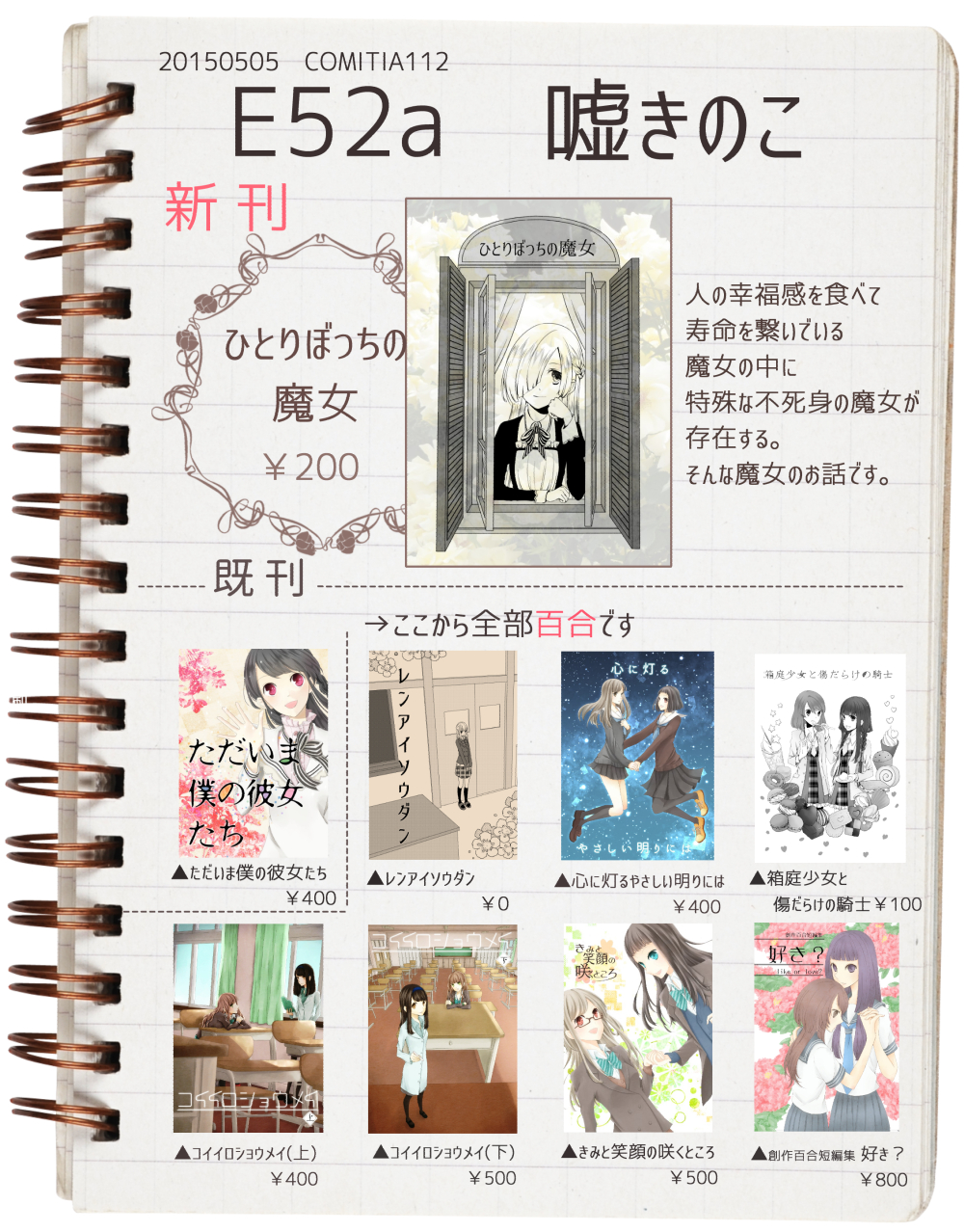 COMITIA112参加します★ Category:同人関係 Date:2015年05月04日 遅ればせながら、明日のCOMITIA112のお知らせです★2015年5月5日 COMITIA112 配置:E52a新刊◆ひとりぼっちの魔女 pixivにてプロローグ兼サンプルupしております。COMITIA112新刊◆ひとりぼっちの魔女 by こな on pixiv不死身の魔女のお話です。前に雪うさぎとかいう漫画を描いていますが、その魔女の設定だったりするのですがこういうことだったんだ~と思うところはあるかと思います。といっても雪うさぎは二年前の作品だしな…当日のおしながきです。 pixiv版↓COMITIA112◆おしながき by こな on pixiv こんなポスターかかげますが、白黒なので目立ちにくいですかね…上のダイジェストサンプルみたいなのもポスターの下につけようと思って作ったのですが、これサイズ的に横向きで作るべきだったので、ちょっと作り直します…また、今回は12:30~13:00の間から1時間半前後席を外す予定なのでスケブは申し訳ありませんが、別の機会で描かせていただけると嬉しいです。戻ってきてからだったら、大丈夫、だと思います!その場合先に寄っていただいて、後でと考えているやさしい方がいらっしゃいましたら、先に寄って下さった事を伝えていただけるとありがたいです…!席外す時と戻る時はついった【http://twitter.com/co_naca】でお知らせ致しますので外している時にスペースに誰か居たら不審者です。それでは、製本頑張ります~明日は何卒よろしくお願い致します。中綴じ製本楽しいです [1回]