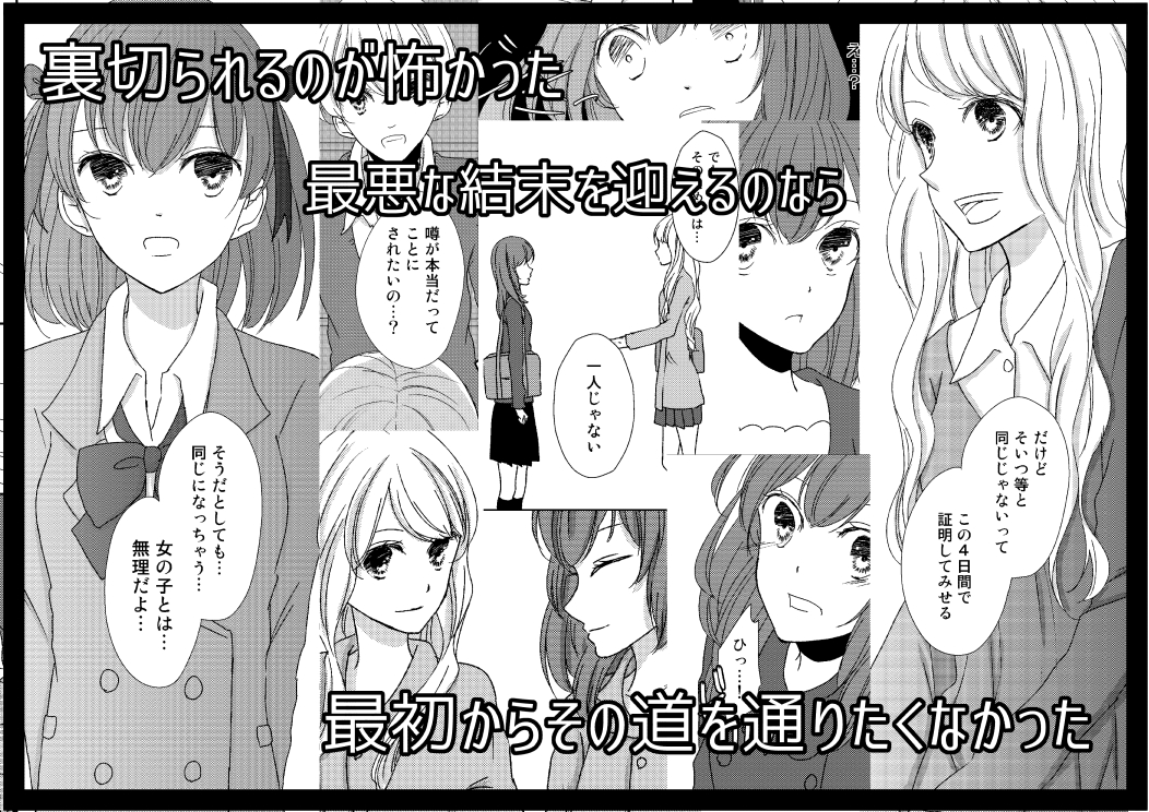 COMITIA112お疲れ様でした! Category:同人関係 Date:2015年05月07日 コミティア112お疲れ様でした!当サークルにお立ち寄りいただき、拙作を手に取って下さり本当にありがとうございます…! ずっとトレペ表紙をやってみたかったのですが、無線綴じだとコピー本の製本上の都合でのりがネックになってくるのでほぼA5サイズで中綴じ可能なのが判明した時から時期を狙っていたので、実現出来て良かったです…!ただの自己満足なのですが、褒めていただけて凄く嬉しいです…ドピコサークルなので5月は埋もれてしまいがちなのと、いつもの百合サークルの島とはだいぶ離れていたのですが、わざわざ足を運んで下さってありがとうございます…!配置的に百合も手に取っていただけると、とても嬉しくて…!変な顔になってしまいそうになります…今回のスペースはこんな感じでした。 おしながきに入れた、百合短編並びきりませんでした…今回の新刊ですが、あとがきに記載いたしましたが、エピローグ(こじつけ)を後日pixivとサイトにアップ致します。(まだプロットもできていないのですが、回収していない伏線も回収される…筈です)次のイベントまで日があまりないので、なるべく早く(当社比)公開出来るようにがんばります…!また、それに伴いダウンロード購入出来るよう、手はずを整えられたら…と思います。次のイベントは6月14日のGirlsLoveFestival14です。思ったよりも近かったので頑張ります…サークルカットにタイトルも書いちゃったので…;では、続きからはいつものやつ+aです。 つづきはこちら [2回]